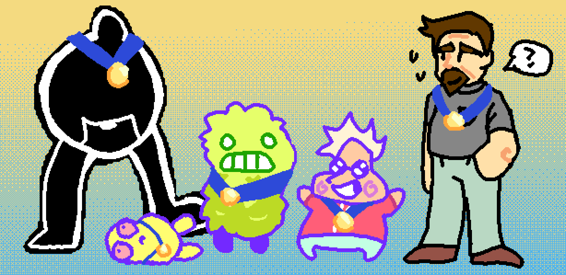 This one was used for just a newspost where we talked about the last 5 characters chosen, haha. They were not the last 5 drawn- many needed backups, but this art is cute. What an odd collection! Sometimes I prefer drawing in Asprite just because the paint bucket tool makes things faster sometimes.