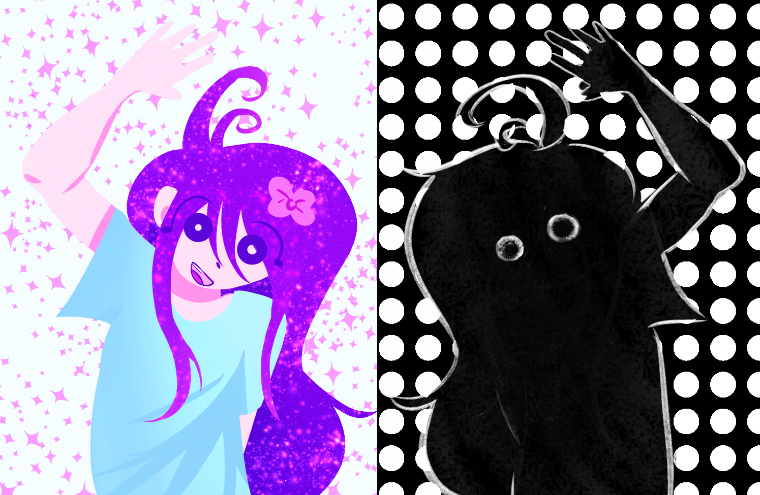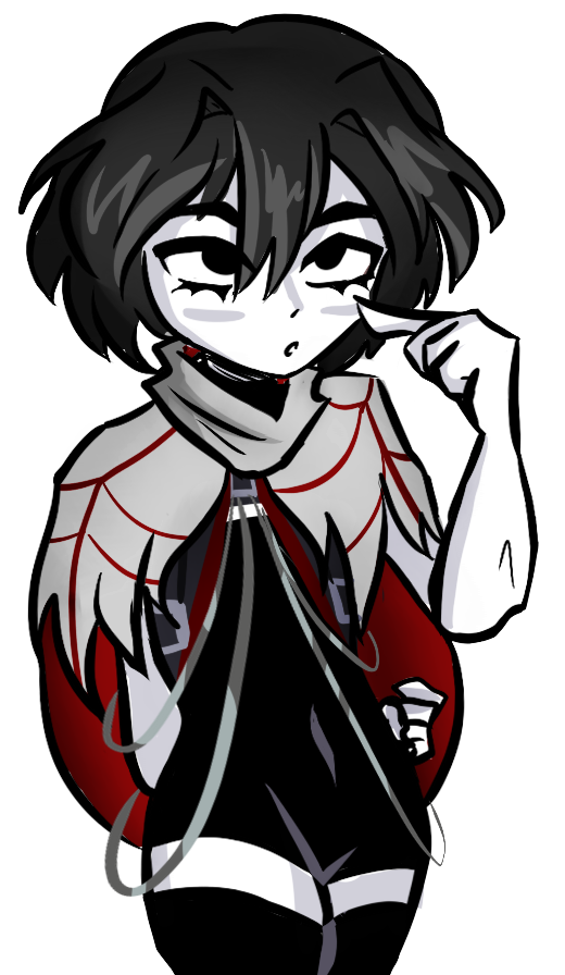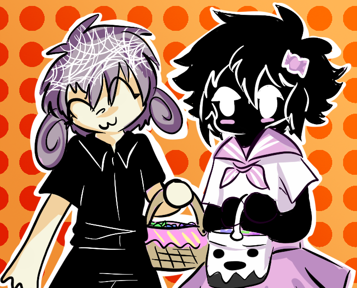 This one I made for the halloween event, where people who played the Hikikomori route of the game could get a second character exclusive to it. Lots of people hadn't played it so we wanted to encourage people to do so before the final video gave them spoilers! I don't think this art ever actually got posted anywhere, but it's cute. Cursey is Skylar's character and Stranger is mine, so sometimes we'd use them to represent ourself in the project.