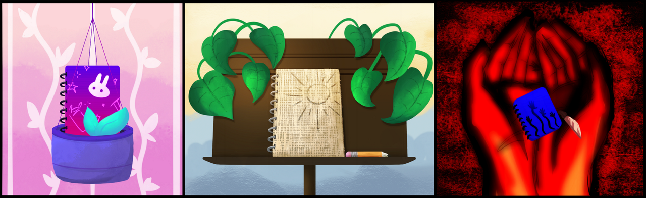 All three of these journals look so authentic and fitting on their backgrounds and in their pixelart versions. Imagine if they were sold as merch?