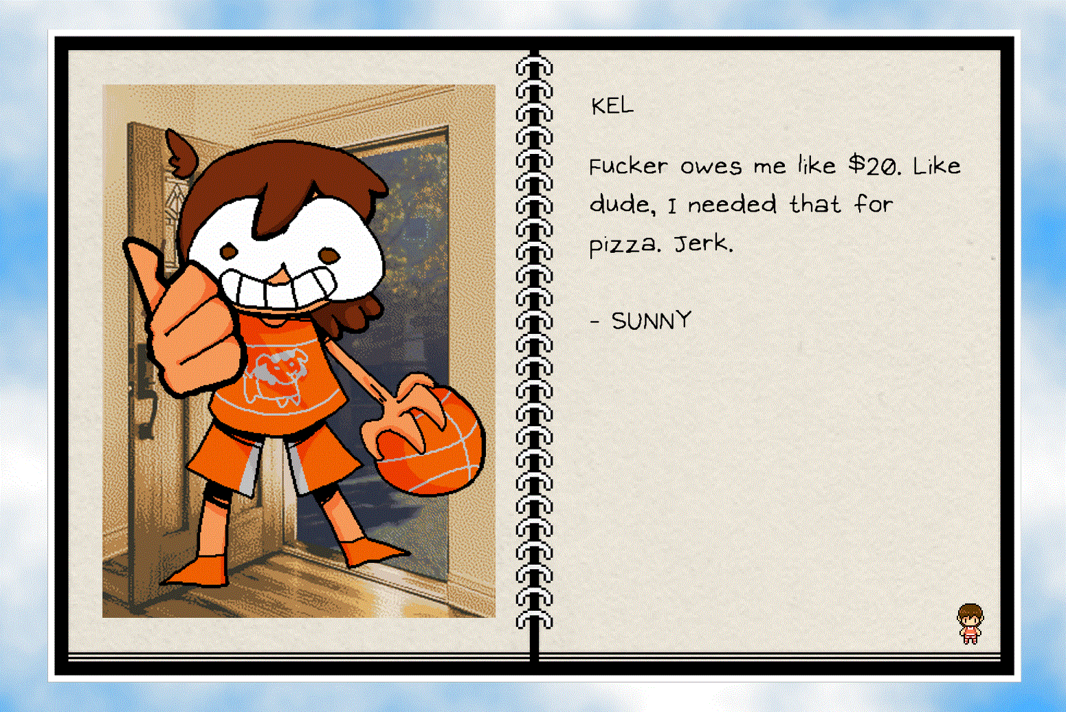 Sunny caught swearing in his journal again! Honestly, that's an appropriate reaction to seeing the chicken Kel thing that owes him money in the doorway.