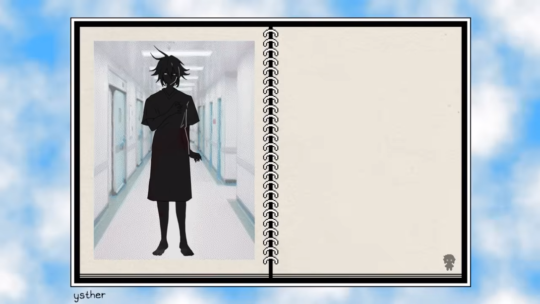 This assignment was a little odd haha. In the game, Stranger does appear in the hall and if you follow him you can get to the good ending/Basil's hospital room. We did want him in a hospital gown, but without any of Basil's injuries since while Sunny could figure Basil was in the hospital (might've overheard something about it...?) he wouldn't know what his injuries look like yet.